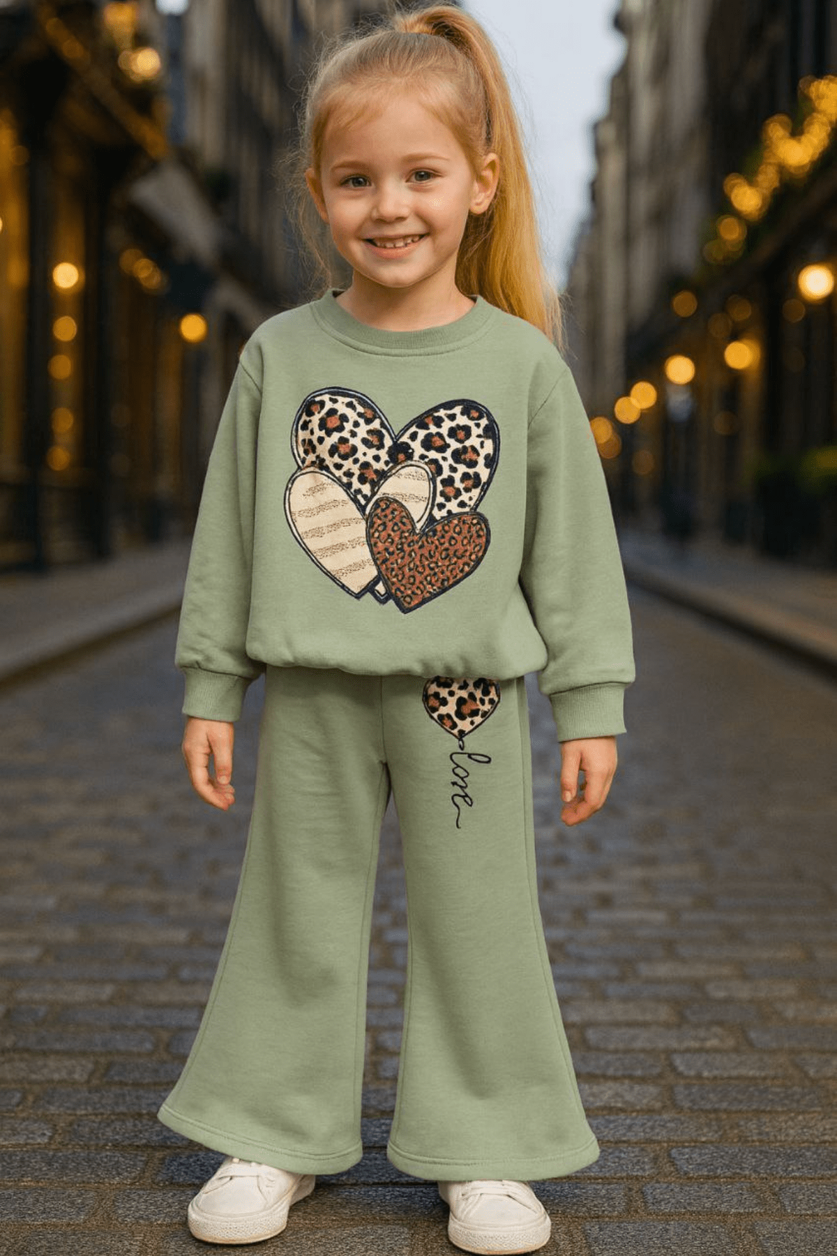 2-10 Yaş Kalp Nakışlı Uzun Kol Kız Çocuk Eşofman Takımı Su Yeşili