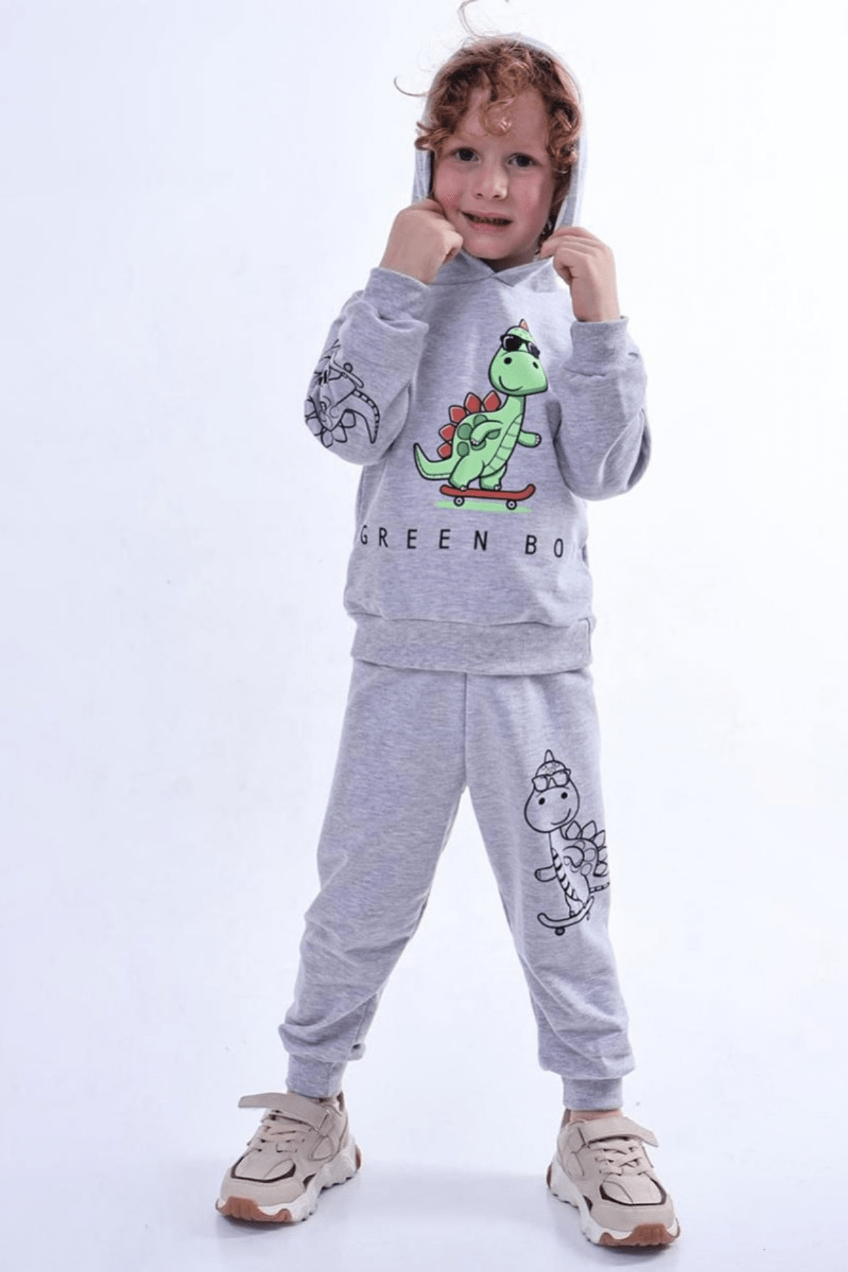 2-6 Yaş Dino Baskılı Kapüşonlu Erkek Çocuk Takım Gri (STK-2711)