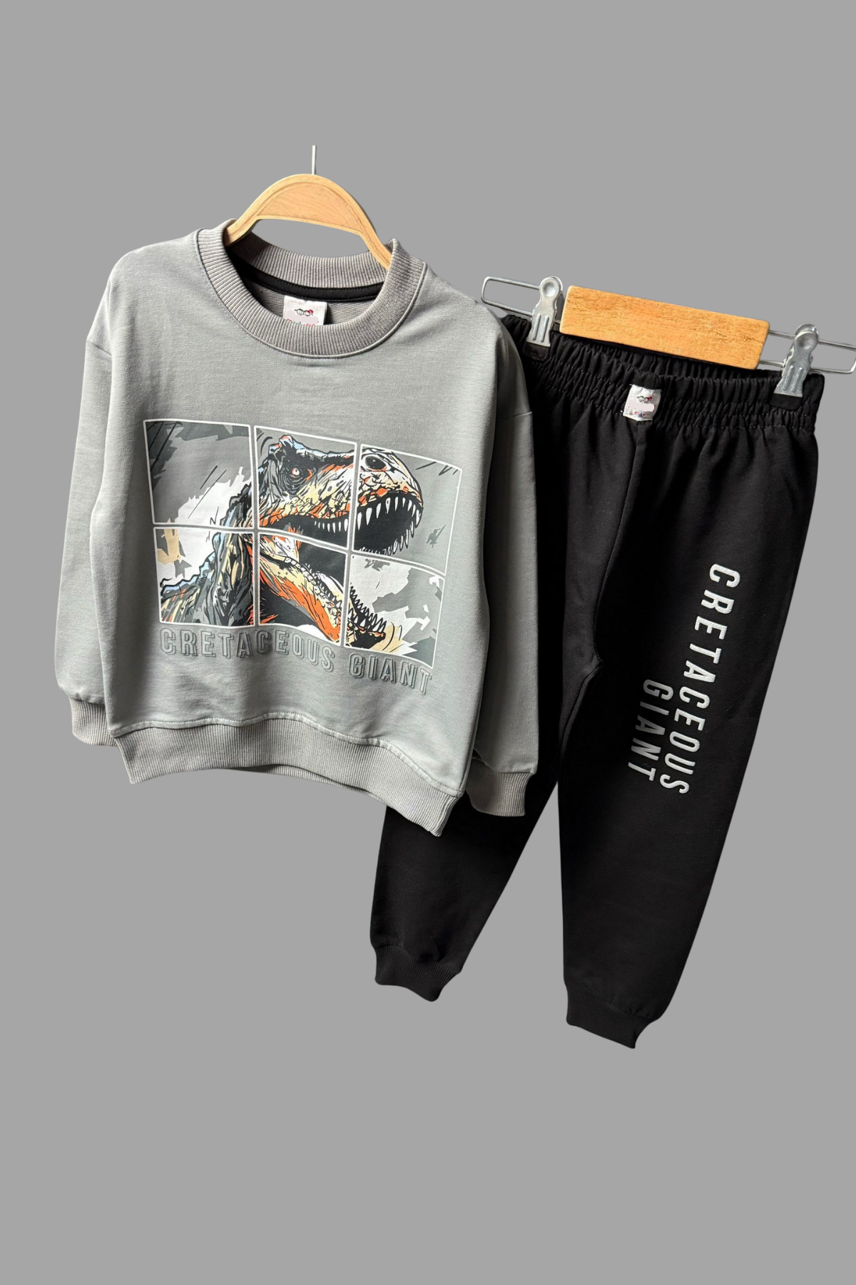 3-10 Yaş Dinazor Baskılı Erkek Çocuk Eşofman Takımı Gri 2 ip Takım