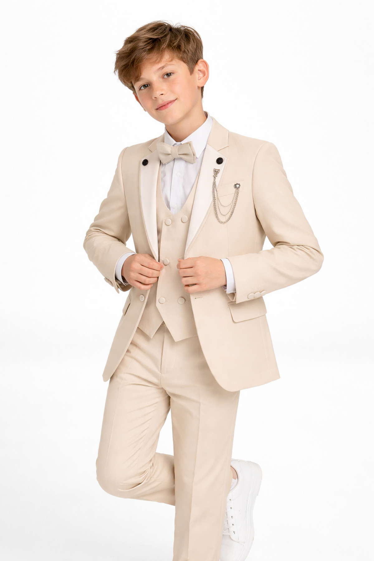 Takım elbise, modern çizgileriyle dikkat çeken Zincir detaylı şal yaka ceket ve zarif bir gömlek ile tamamlanmıştır. Şıklığını pekiştiren papyon ve cep mendili detaylarıyla, çocuğunuzun özel davetlerde zarif ve stil sahibi görünmesini sağlar. Bu takım elbise, düğün, doğum günü, mezuniyet gibi özel günler için mükemmel bir tercihtir.
