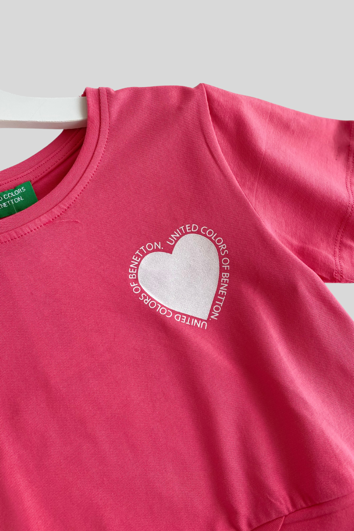 4-14 Yaş Benetton Kalp Baskı Kız Çocuk T-shirt Fuşya