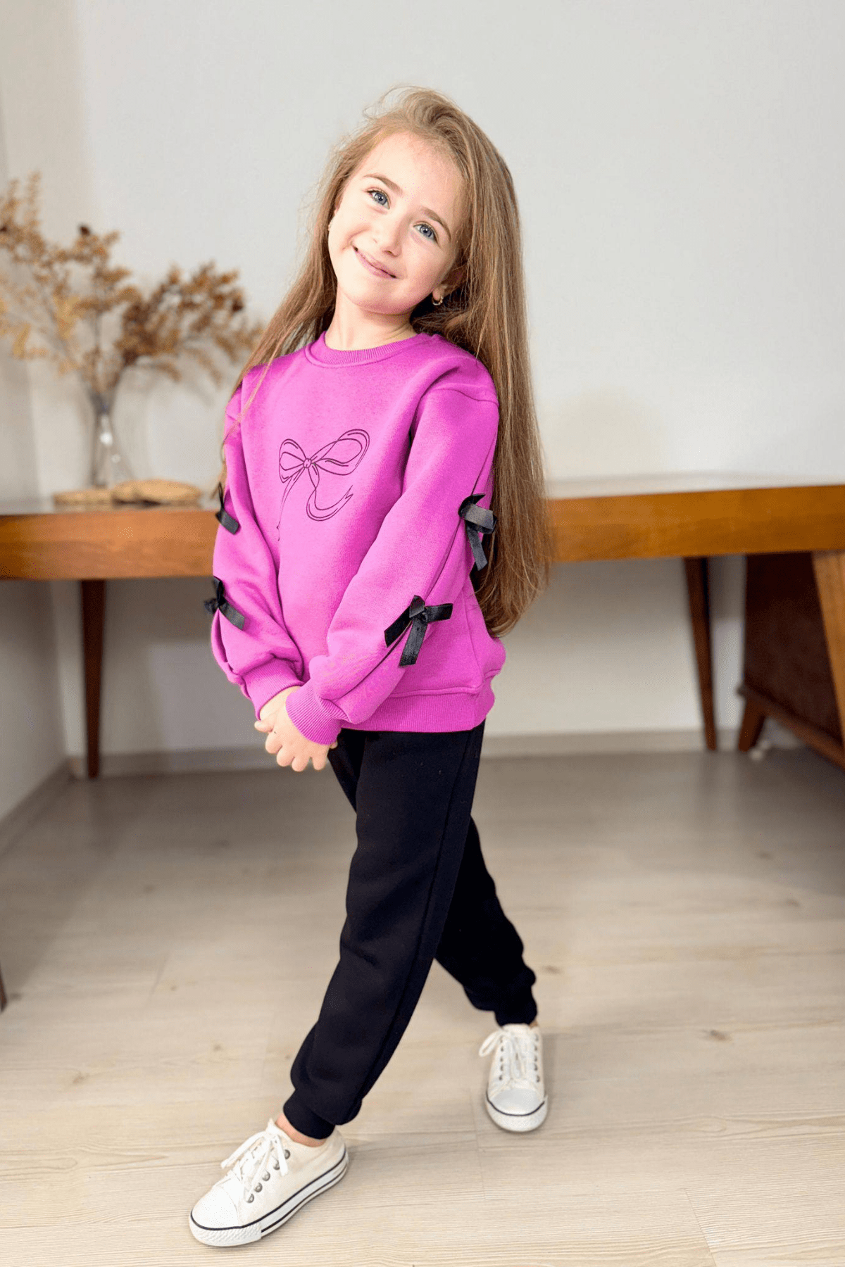 5-14 Yaş Kolları Fiyonklu Kız Çocuk Eşofman Takımı Pembe