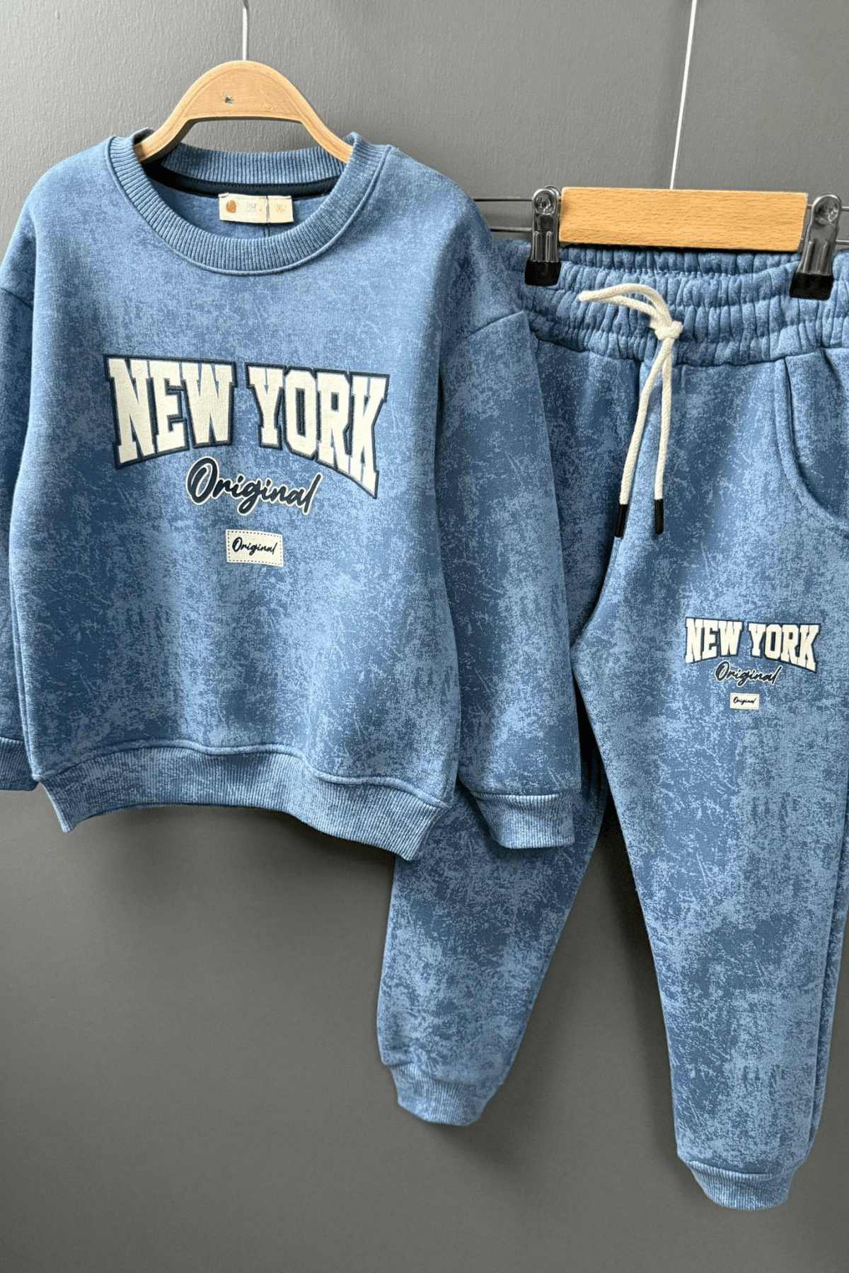 5-14 Yaş New York Batik Desen Erkek Çocuk Takım Mavi Fırçalı Kumaş