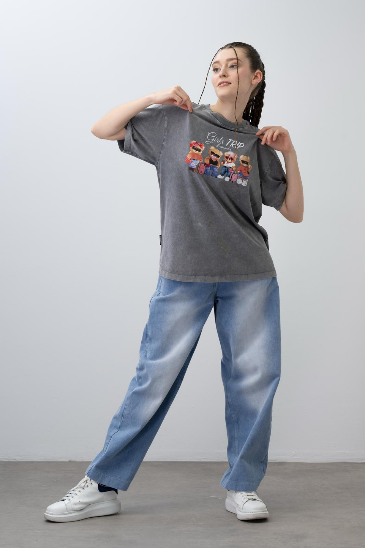 9-14 Yaş Ayıcık Baskılı Kısa Kol Tek Tişört Gri