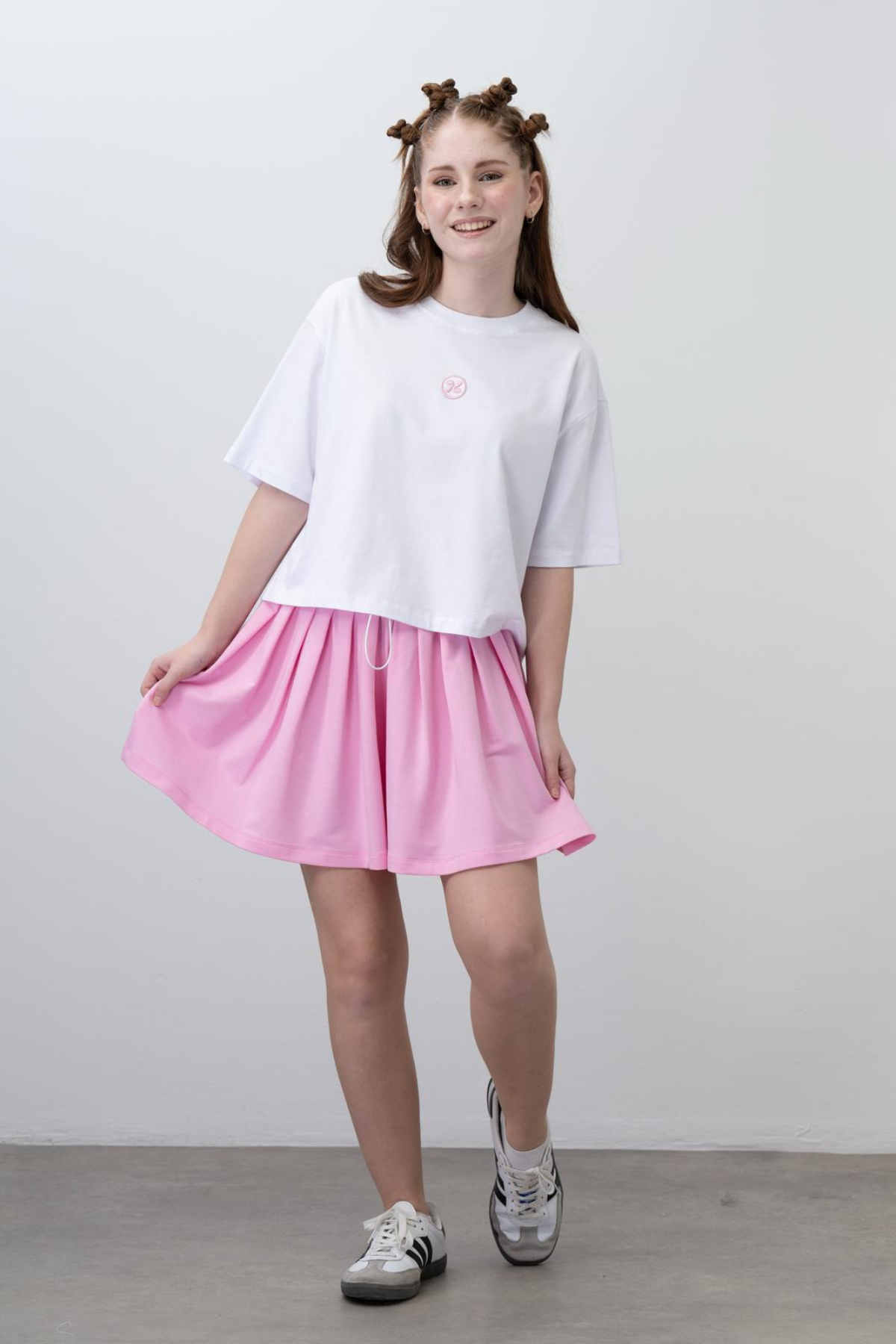 9-15 Yaş Nakışlı Tişört Pilili Etek Kız Takım Pembe